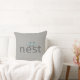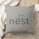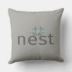 Simple grey typography with "Our Nest" on throw pillow with two patterned birds. The background colour can be changed to match your decor and style. Design by Simple Living.