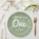 Our little baby is turning one first baby birthday round paper plates. These plates are sage, green, with white. The word "One" is in large letters in a cute typography style with a modern and minimal design. Simply, customize these plates, add them to your cart, and happy birthday to your wonderful baby!