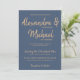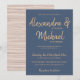 Elegant trendy typography wedding invitation in dark midnight blue with light beige tan lettering featuring big bride's and groom's first names calligraphy script. On the back side, there is a stone like striped beige, dusty rose and grey whimsical pattern. ---- Please note that the navy background colour on front side is editable. You can change it after selecting CUSTOMIZE further option. ------- The invitation is suitable for any season - spring, summer, autumn, winter - indoor wedding reception.