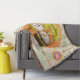 Pretty Christmas holiday throw blanket with typography text sayings background, stars, snowflakes, polka dots on orange, and a snowman couple in top hat and winter hat and scarf with a mustard yellow banner that reads Merry Everything!