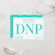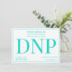 A DNP graduation party invitation in teal and white. This invitation also has a pattern of the word DNP on the back.