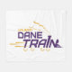 The UAlbany Dane Train logo features bold, angular typography with the words "Dane Train" in large, purple capital letters. Above it, "UAlbany" is written in a smaller, golden font. The design incorporates the silhouette of a train, with smoke billowing from the smokestack. The train's wheels are represented in gold, giving the appearance of movement, and golden streaks on the left emphasize speed and momentum. The logo exudes a dynamic and energetic vibe, combining elements of strength and motion, reflecting a sports or team spirit.