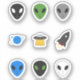 A collection of Stickers with alien in green, blue, grey, black, outline, a rocket and a blue planet for extraterrestrial lovers and those who believe in abduction!