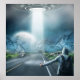 ufo alien spaceship and hitchhiker surreal fantasy science fiction poster. This weird and wonderful sci-fi poster depicts a ufo spaceship stopping to pick up a lonely hitch hiker on a road at night. Perfect for any science fiction fans of the alien genre of films and movies etc. Makes a great poster gift with a photograph quality