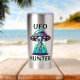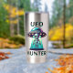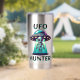 Alien and UFO graphic for those into UFOlogy. A cute alien being breamed down from a UFO. Text says, "UFO Hunter" in black and turquoise stickers.