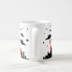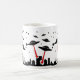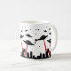 This mug features a repeated design of UFOs, with red lasers, invading a city. The background colour can be customized if desired.