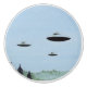 A watercolor, pen and ink, and colour pencil drawing of three flying saucer UFOs over the mountains.