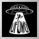 Vector cartoon illustration of a UFO abducting a person that thinks aliens rock with UFOMG text. Tags: UFO, OMG, unidentified, flying, object, oh, my, god, space, spaceship, alien, martian, cartoon, devil, horns, abduction, fourth, kind, humour, saucer