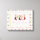 Canvas art with a repeating pattern in the background, in an ugly Christmas sweater style. The pattern is composed of socks, christmas balls, stars and snowflakes. With repeating Merry Christmas text in red. Fun and festive. Layered over top is a white rectangle with a faux gold foil border, inside is an illustration of old-fashioned hanging stockings and the text: Merry Christmas.