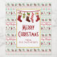 A wine/beer label with a repeating pattern in the background, in an ugly Christmas sweater style. The pattern is composed of socks, christmas balls, stars and snowflakes. With the repeating Merry Christmas text in red. Fun and festive. Layered over top is a white rectangle with a faux gold foil border, inside is an illustration of old-fashioned hanging stockings. Merry Christmas and your personalized text inside. All text is editable.