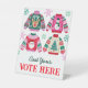 This ugly sweater 'cast your vote here' sign features 4 christmas sweaters with lots of fun christmas icons such as Santa, Reindeer, a Snowman and a Christmas Tree surrounded by snowflakes in a colour palette of red, green and pink. You can customise the text. See the whole matching collection.