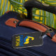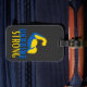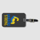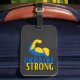 Dark luggage tag design has flexed bicep muscle graphic with Ukraine strong text in blue and yellow colours of the Ukrainian flag. Slava Ukraini!