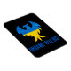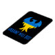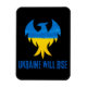 An inspirational magnet design that echoes the resilience of the Ukrainian people features a phoenix bird silhouette in the blue and yellow colours of Ukraine's flag with "Ukraine will rise" text in distressed font.
