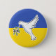 Ukraine anti war button featuring a white dove carrying an olive branch on a blue and yellow Ukranian flag background.