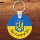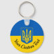 Round keychaintag with the flag of Ukraine, a blue and yellow flag with the Ukrainian coat of arms (emblem) with a trident in the centre, and a custom text template for your message