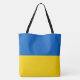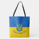 Tote bag with the flag of Ukraine, a blue and yellow flag with the Ukrainian coat of arms (emblem) with a trident in the centre, and a custom text template for your message