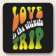 A fun, groovy saying that was a favourite with peace loving hippies in the sixties: Love Is The Ultimate Trip in vibrant colours and psychedelic font and retro word art lettering style. A great gift, too!
