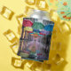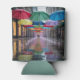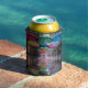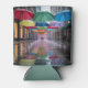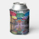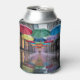 This can cooler features a vibrant urban street scene with colorful umbrellas suspended like a natural canopy. The umbrellas are red, green, blue, yellow and purple colors. The wet street contains reflections of the umbrellas and hanging decorative lights. The storefronts on either side are buildings with large windows. Small glass pendant lights hang vertically from strings, creating a magical suspended effect. The lights are arranged in a formation that extends down the street. The wet pavement reflects the colors of the umbrellas and lights, creating a mirror-like effect with colored reflections. The image has a dreamy, ethereal quality with the umbrellas and lights creating a path of color and light. The can sleeves are made of polyurethane foam. The can coolers are made for twelve ounce cans. Umbrella Day is celebrated on February 10th.
