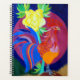 The classical extravagant rooster and one of the most common birds in Umbria, especially in the countryside in Umbria where Jean lives. Multi-coloured and decorated with a flower invented by Jean and the usual large sun in the background. The sun in this image is purple. The rooster, standing tall and proudly, is brightly coloured with mainly blue, purple and orange feathers. A rooster is one of the signs of the Chinese Zodiac.