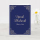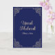 Umrah Mubarak Navy Blue Islamic Gift Greeting Card. This is an elegant and luxury card design with a gold scroll filigree in the corner of the border. There is a classic script font. You can customize this product by changing the text that is written inside and also the names of the family members that went on this religious trip. Created by Her Line For Design.