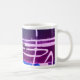 Un joli imprimé abstrait, avec des couleurs de blues et de violets, sur une tasse blanche classique, avec le texte "SERENE~CALM~PEACE"