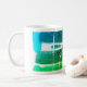 Un joli imprimé abstrait, avec des couleurs bleu, vert et noir sur une tasse blanche classique avec le texte "Bliss bleu vert"