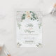 Cette carte d'invitation a un style doux et élégant avec une palette de couleurs pastel dominée par les tons vert et blanc. En haut, il y a un bel agencement de fleurs blanches et crème, y compris des roses et d'autres fleurs délicates, entrecoupées de feuilles verts. Les noms sont affichés en évidence dans le centre dans une police élégante et cursive, avec une illustration des anneaux de mariage entrelacés sous les noms. L'ensemble est sophistiqué et romantique, adapté à une fête mariage. F002
