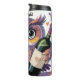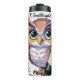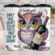 Cette illustration graphique originale présente un hibou stylisé avec de grands yeux expressifs et des plumes feuillées, tenant une bouteille de vin avec son talon. Le texte à gauche dit : "NE PRENEZ PAS DE CONSEILS DE MOI, VOUS FINIREZ SEULEMENT PAR BOIRE." L'art a un ton amusant, fantaisiste et très humoristique.