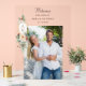 Ce joli poster d'accueil botanique d'hiver présente des bouquets de roses et de fleurs d'ivoire, des baies rouges, des flocons de sapin et d'or entourant un élégant étiquette d'or pour votre monogramme sur un arrière - plan gris perle pâle. Inclut les champs de texte modifiables et le modèle photo.