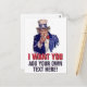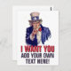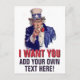 World famous poster of Uncle Sam who wants you to join the U.S. Army. Classic poster from 1915, must have for any patriotic American. Add your own custom message to the design.