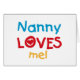Nanny Loves Me T-shirts, cards, stickers, bodysuits bags, and more with colourful red, yellow, and blue text and heart design. These Nanny Loves me apparel and gift items will make nanny smile!