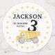 Watercolor cute yellow under contstruction site trucks birthday boy table confetti with name and age included.