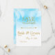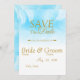 Under the Palm Sky Save The Date is a tropical sky blue watercolor with palm tree accents. On the back the same sky blue and palm tree watercolor with initials for the bride and groom.