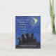 The greeting card message notes, "When we are apart, I remember that we all live under the same moon. Long distance hugs to you". The art shows the shadows of three humans, a dog, and a cat gazing up at a crescent moon under a star-filled sky. Art was made using acrylic washes followed by pastel on paper.