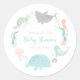 This under the sea themed baby shower sticker features a whale, tiger shark, jelly, sea turtle and seahorse all