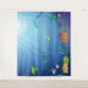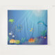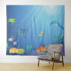 Sea creatures under the sea illustration backddrop for party, event, or theatre. The colourful image shows an underwater scene with a sea turtle, dolphin, octopus, and several fish and coral, with light filtering down from above.