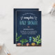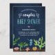 This nautical couples baby shower invitation has a whimsical "Under the Sea" theme, with watercolor shells, a starfish, a seahorse, seaweed, and a pretty, textured navy blue background.