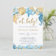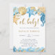 Under the sea, blue and gold baby shower invitation features watercolor seahorses, starfishes, seashells, and coral reefs with whimsical calligraphy. For more advanced customization of this design, please click the BLUE DESIGN TOOL BUTTON. Matching items are also available.