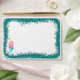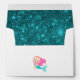 A pretty mermaid party envelope, perfect for those mermaid birthday invites, featuring a cute little mermaid with pink hair in the corner, surrounded by a frame of teal glitter, with (simulated) glitter also on the inside of the envelope, and another cute mermaid on the back. Ideal for a little girl's mermaid birthday party announcement or mermaid baby shower invites (for instance).