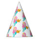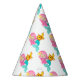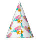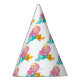 A very cute mermaid party hat most suitable for a children's mermaid birthday party. The design features a pattern of little mermaids with pink hair, patting their pet goldfish. These hats would make great mermaid party decorations as well, or mermaid party favours for your guests to take home.