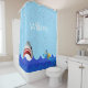 An under the sea, shark themed shower curtain. Pastel blue background, bubbles, blue waves, a scuba diver, and a shark. Template for a family name. A hand lettered style script in white.