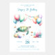 Explore an oceanic wonderland with this enchanting watercolor-themed birthday invite design. You'll find a delightful turtle, colourful bunting, and balloons that'll create the perfect marine life setting. Customize now and embark on a joyful journey beneath the sea!