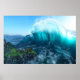 A massive wave leaps up from rough seas, sparkling white and blue and turquoise in the blazing sunlight. Under the wave, about to be submerged, is a little town with a castle and medieval cottages built on a rocky headland.