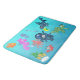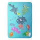 Bath mat with cute cartoon sea creatures, including an octopus and squid, shark, fish, seahorses, a sea turtle, and a crab.