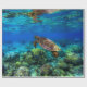 Swimming with the tropical exotic sea turtles! Vibrant photo shot diving just below the surface of the blue tropical sea waters. Watching the sea turtle swim around the coral reef with small colorful tropical fish nearby. Sea turtles can live up to 100 years, hold their breath underwater for up to 5 hours at a time, eat jellyfish, and can weigh up to 2,000 LBS. Perfect high quality tropical photo wrapping paper for a unique gifting experience!