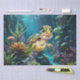 Underwater adventures with the cheerful turtle. The design features a charming cartoon turtle swimming elegantly through a vibrant coral reef. The turtle has a bright green shell decorated with playful patterns and a bright yellow underside that shimmers in the water. Large, expressive eyes give it a friendly and curious expression. The coral reef is rich in colourful corals of various shapes and sizes, shining in vibrant colours like red, orange, pink, and purple. Numerous species of fish in cheerful colours swim among the corals.