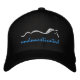 Fits well due to elastic edging, not adjustable. Good qualty material. Good quality embroidering. Subtle lettering (white on beige) just as my wife likes.