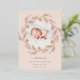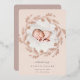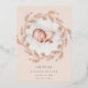 Une élégante faire-part de naissance aux couleurs douces est ornée d'une photo ronde de nouveau-nés entourée d'une couronne de branches botaniques roses en feuille d'or et de feuilles, avec "introduction [Nom]" en bas en lettres gris chic. Personnalisez avec la date de naissance du bébé, et les statistiques de naissance en dessous, et ajoutez un message personnel à l'arrière, ainsi qu'une photo supplémentaire.