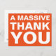 Une carte postale de remerciement massive avec des polices de caractères modernes sur arrière - plan de couleur vive. Il est prêt à être personnalisé et convient comme un message de remerciement pour les amis, la famille, maman, papa, enseignant, infirmière, patron, employé, coach, mariage, douche nuptiale ou baby shower. Pour modifier ce modèle de conception, il suffit de modifier le texte comme indiqué ci-dessus. Cliquez sur le bouton "Customiser" pour ajouter des images ou du texte, customiser des polices et des couleurs. Impressionnez votre famille et vos amis avec le design parfait!