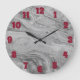 Une horloge aux teintes grises et un arrière - plan en marbre, et des chiffres rouges foncés.
